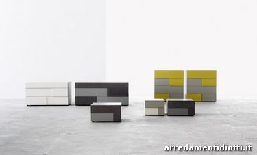 Il gruppo letto Insieme è caratterizzato dai frontali dei cassetti in spessori diversi e finiture diverse; il cambio di profondità crea movimento e dinamismo.